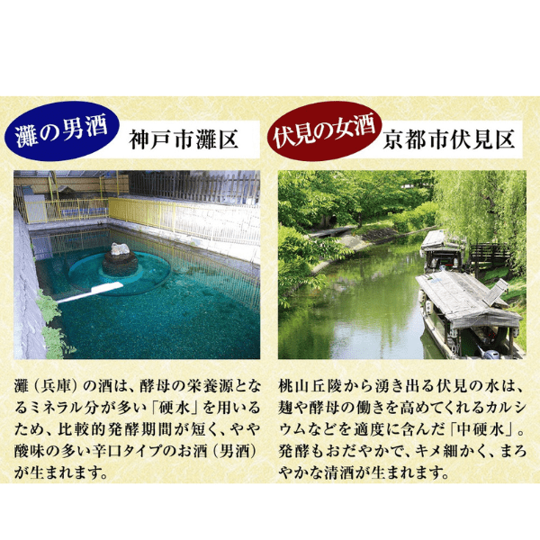 兵庫縣灘五鄉是西鄉、御影鄉、魚崎鄉、西宮鄉和今津鄉的統稱,從日本戰國時代以前就開始釀造清酒,超過600年歷史的著名清酒產區。當地的釀酒用的地下水源名為「宮水」,含有酵母發酵需要的豐富養分鉀磷鎂等礦物質成分,而會讓釀酒過程產生雜味的鐵錳含量非常低,是非常有名的酒造用水。